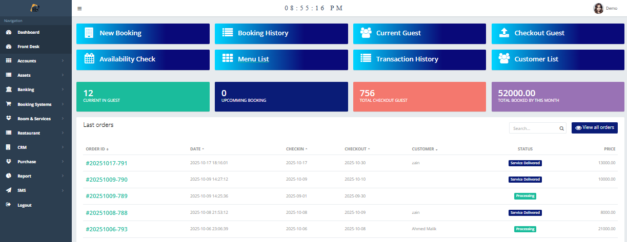 Our Hotel Management System is an innovative, all-in-one platform designed to simplify hotel operations and elevate the guest experience. From room booking and billing to staff coordination and reporting, every feature is built to ensure efficiency, accuracy, and ease of use. By integrating modern technology with user-focused design, this system enables hotel managers to make data-driven decisions, automate daily tasks, and enhance overall productivity. The solution offers seamless check-in/check-out processes, real-time room availability, and comprehensive financial tracking, empowering hotels to operate smarter and deliver exceptional service. Visit Website : http://apps.logic-consultants.com/demo/ Userid : Demo123 Password : Abd1234@
